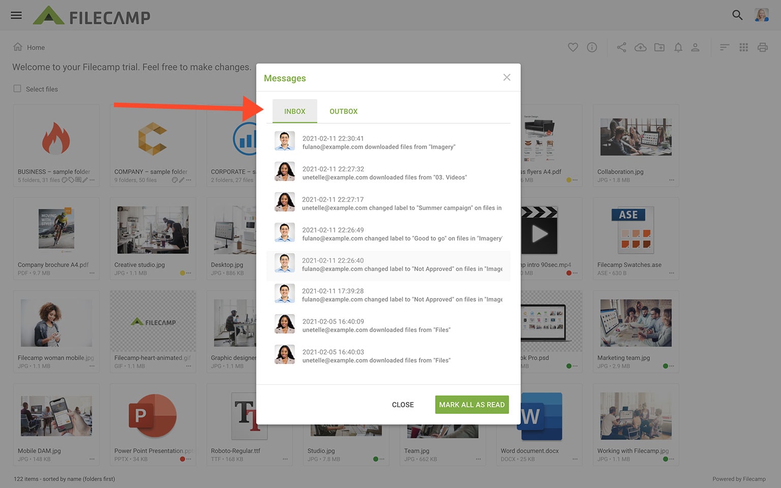 Upon navigating to the Inbox tab, you will see a list of all your messages sorted by date. The following notifications are displayed in your Inbox:
