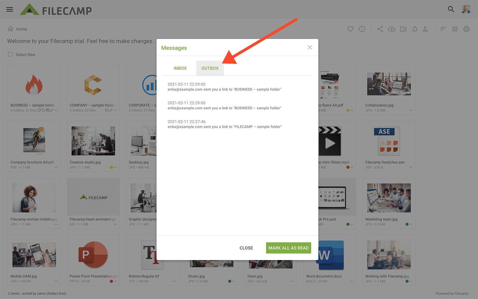 Upon navigating to the Outbox tab, you will see a list of all your messages sorted by date. The following notifications are displayed in your Outbox: